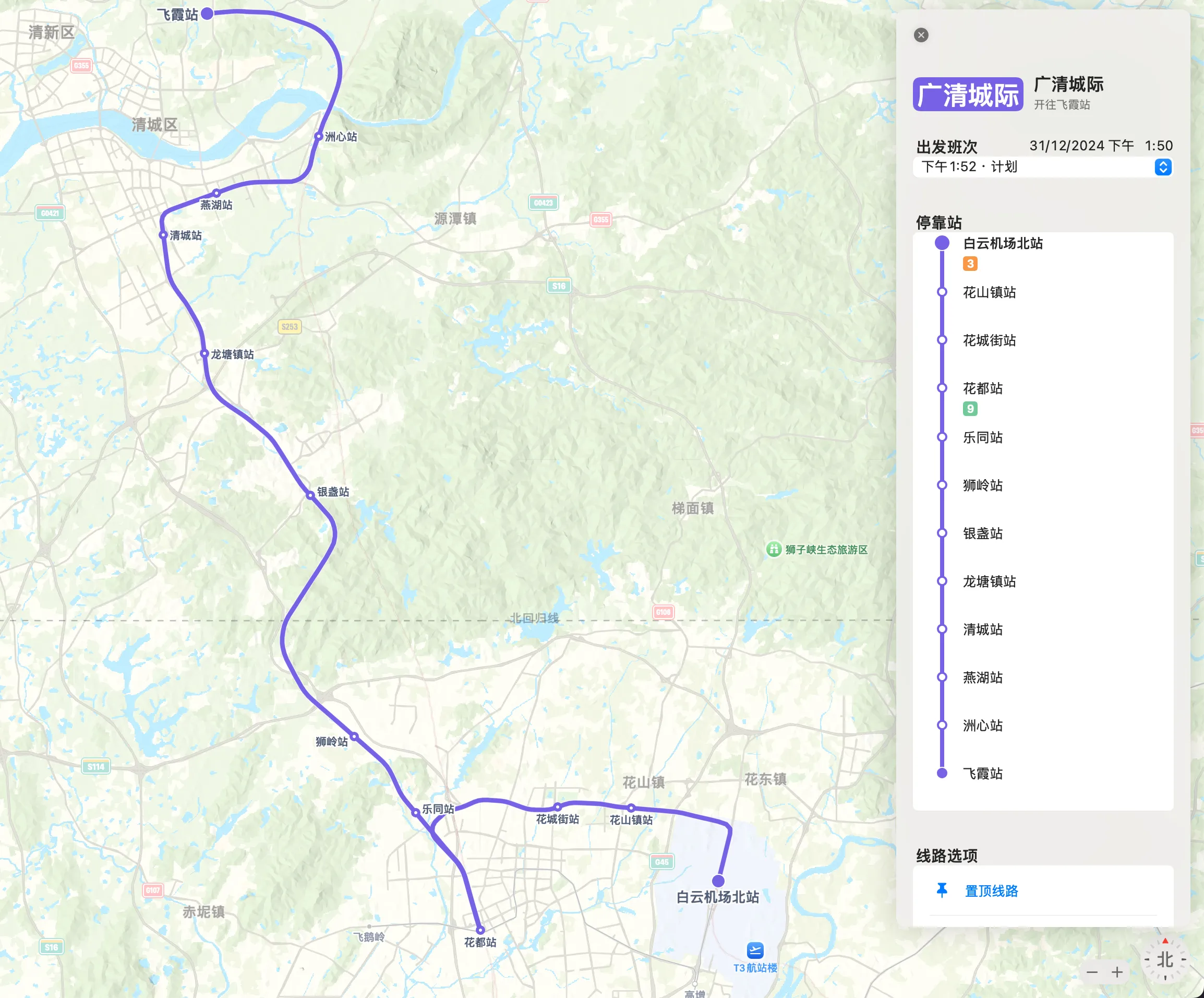 其中,这条线路有直通车,只需要 15 分钟,一站从花都到清城。相比之下,站站停列车要 33 分钟