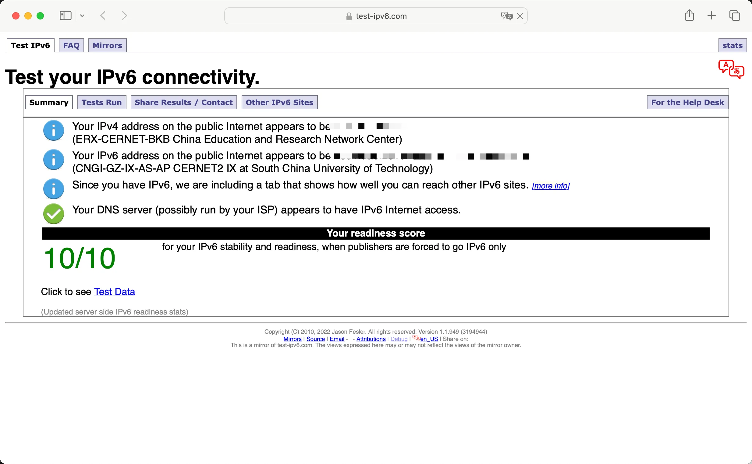 网站 https://test-ipv6.com/ 可以测试 IPv6 连接,直接点开即可测试。