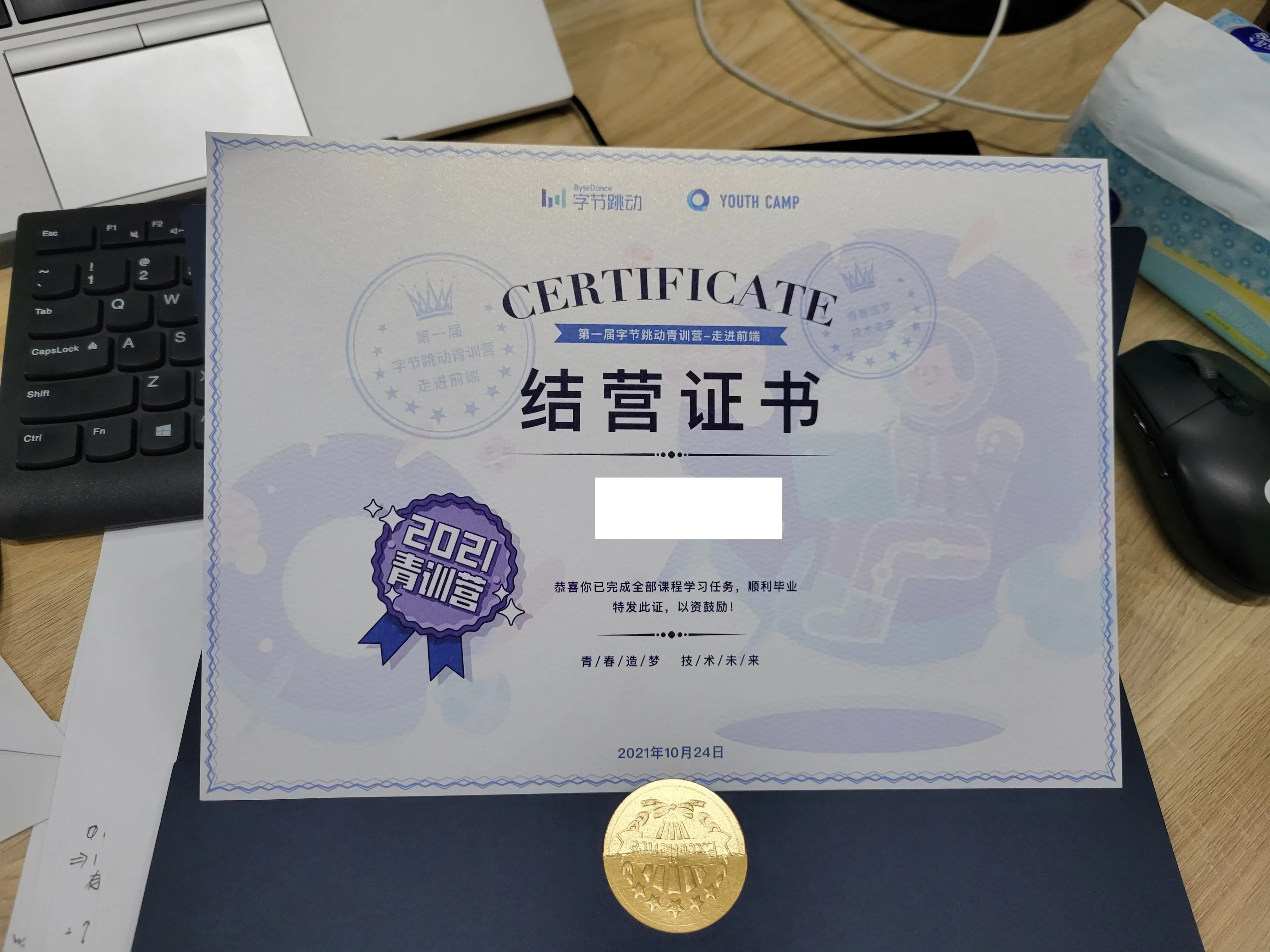大一暑假将近结束,我顺便报名参加了字节第一次搞得前端训练营并进了进阶班,做了项目,最后拿了个团队第二名&结营证书(拿奖比例好像是 50/2000+),还收到了带有李松峰亲笔签名的 JS 犀牛书。不过,按字节那节奏,这玩意迟早会烂大街。果不其然,后面各种高频率举办这个活动 + 放水,于是乎这个经历和奖烂大街了。(PS:据说近年的前端校招简历全是这个经历🤣)
