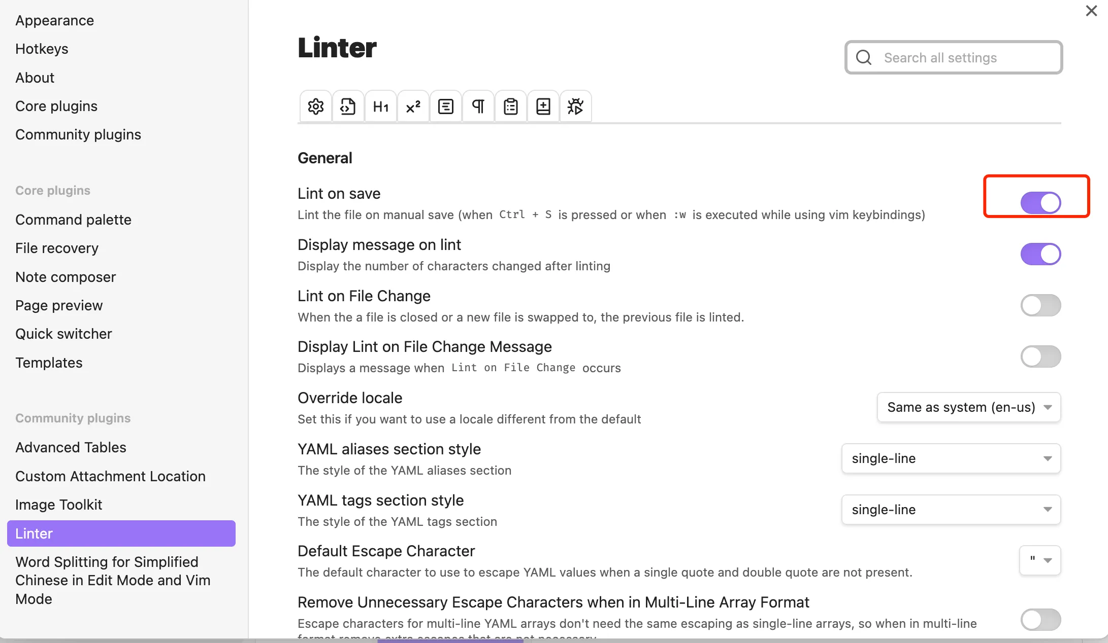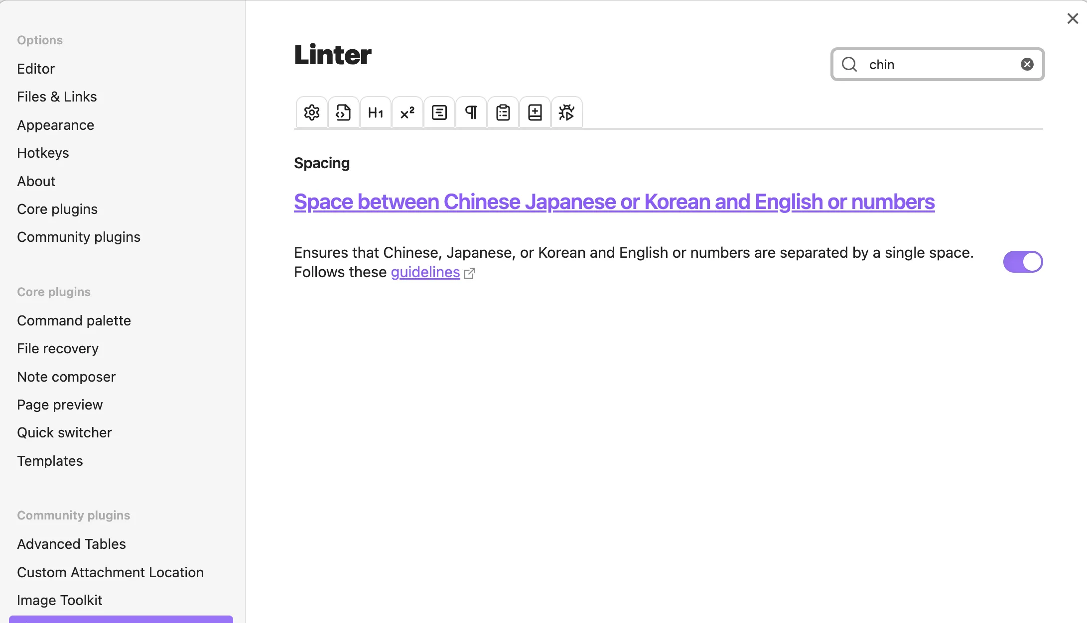 对于 Linter,查找 并打开对应的规则。举个例子,打开中英文字符间插入空格的规则,可以在右上角搜索栏里进行搜索,找到后,启用规则。