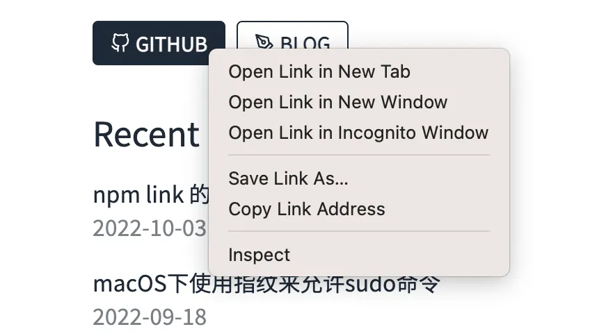 举个例子,这位朋友的的博客主页上面有一个 GitHub 按钮,按下之后,就会跳转到他的同性交友个人主页去。这位朋友他当时的实现,如下所示:
