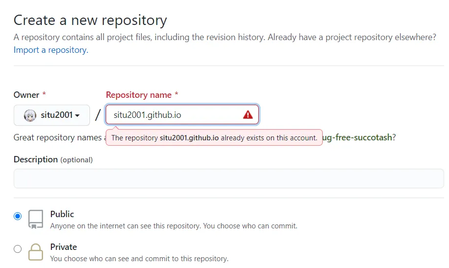 repo 的 name 是 yourusername.github.io ,并且这个 repo 要是 Public 的,填完之后点击 Create Repository 按钮就行了